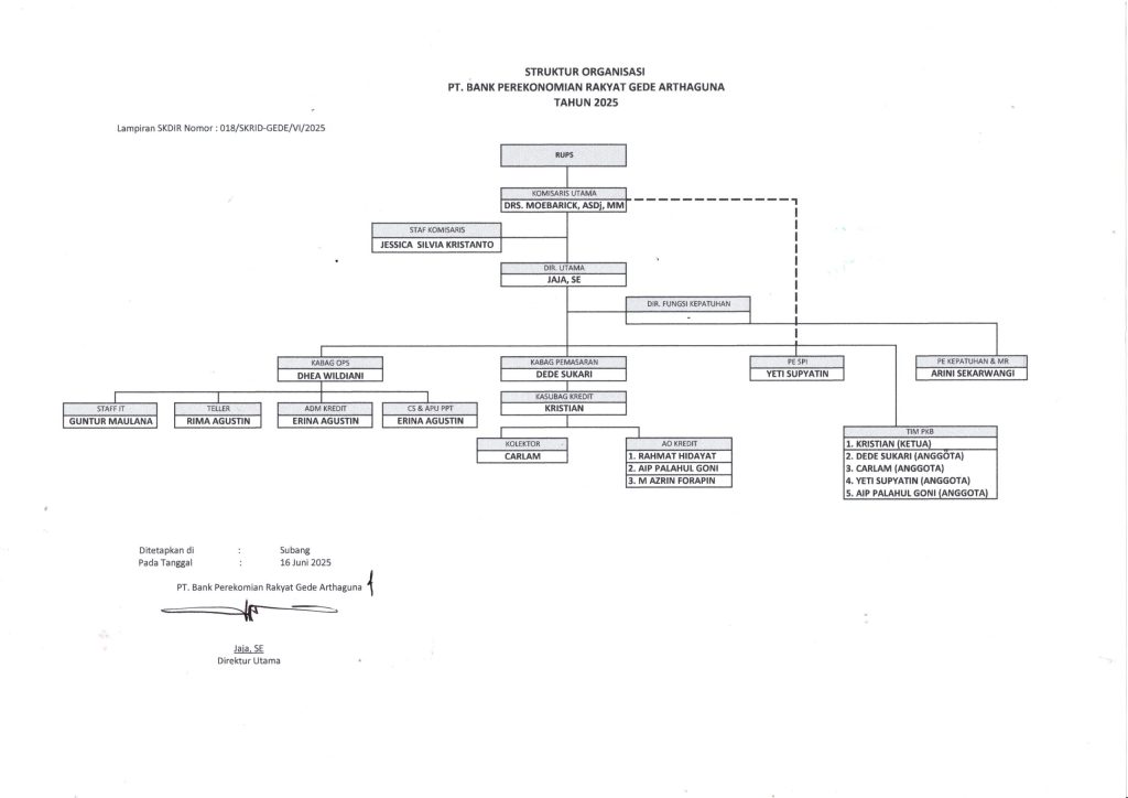 Berikut ini daftar Anggota Dewan Komisaris dan Direksi BPR Gede Arthaguna
